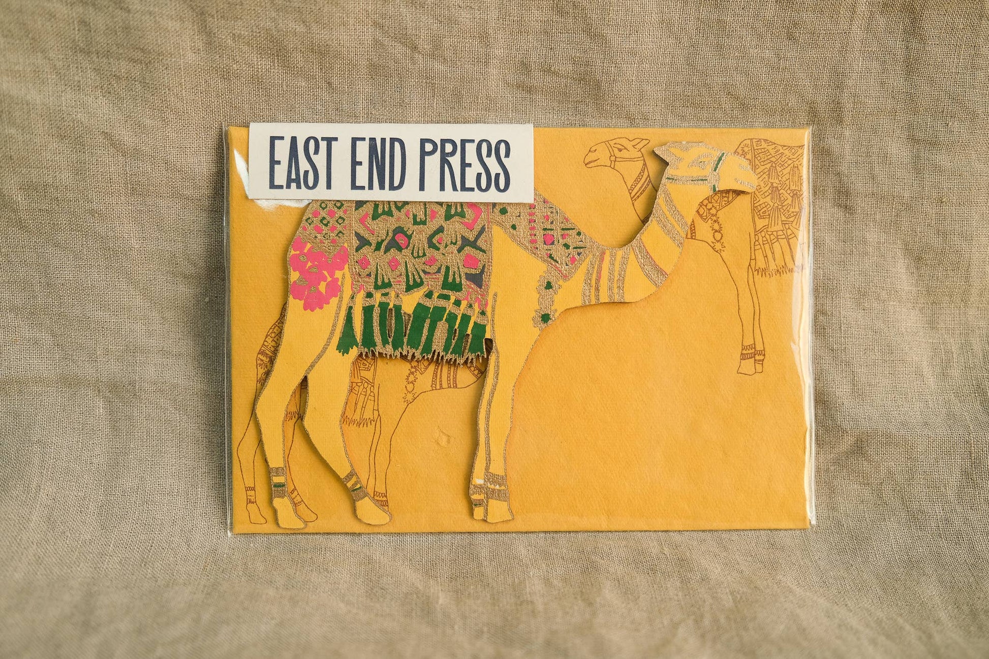 This happy camel stands up and would take pride of place on any mantelpiece! With a panel on the inside for your message, and a colourful printed envelope, this is a very special greeting card! 100% recycled paper content as is standard for all our products.