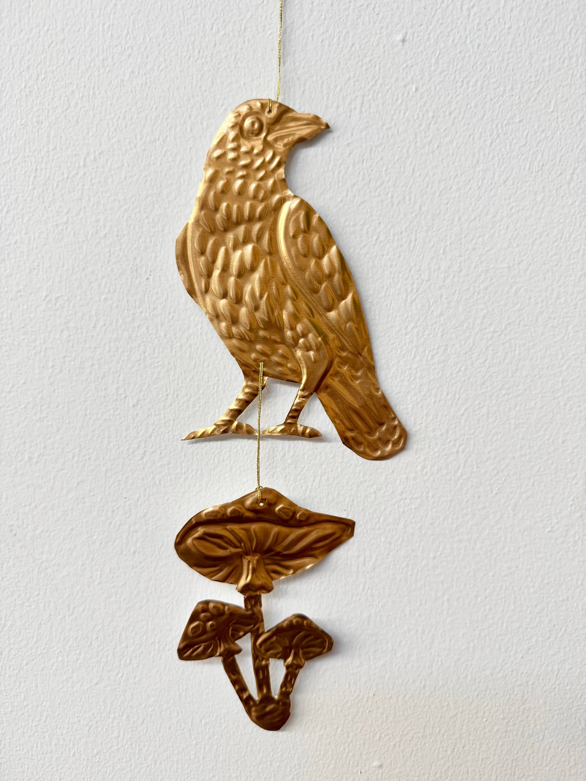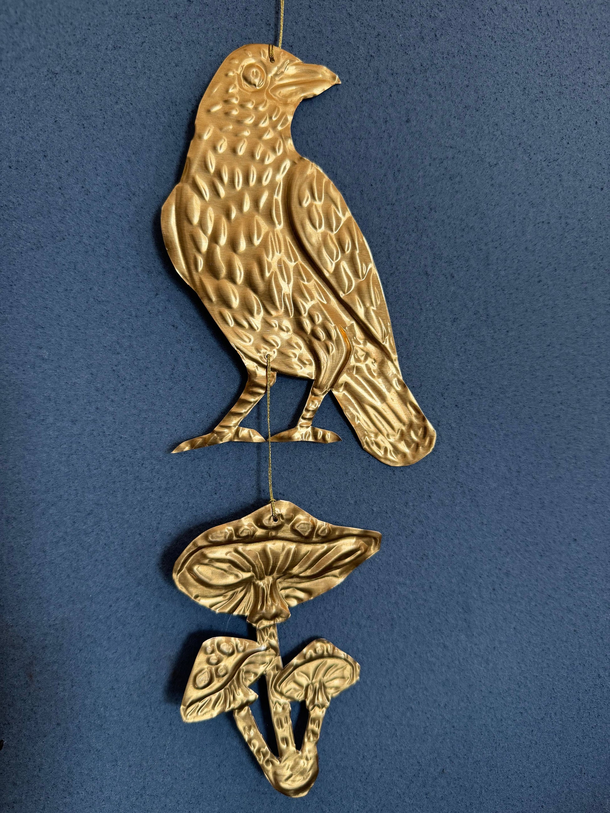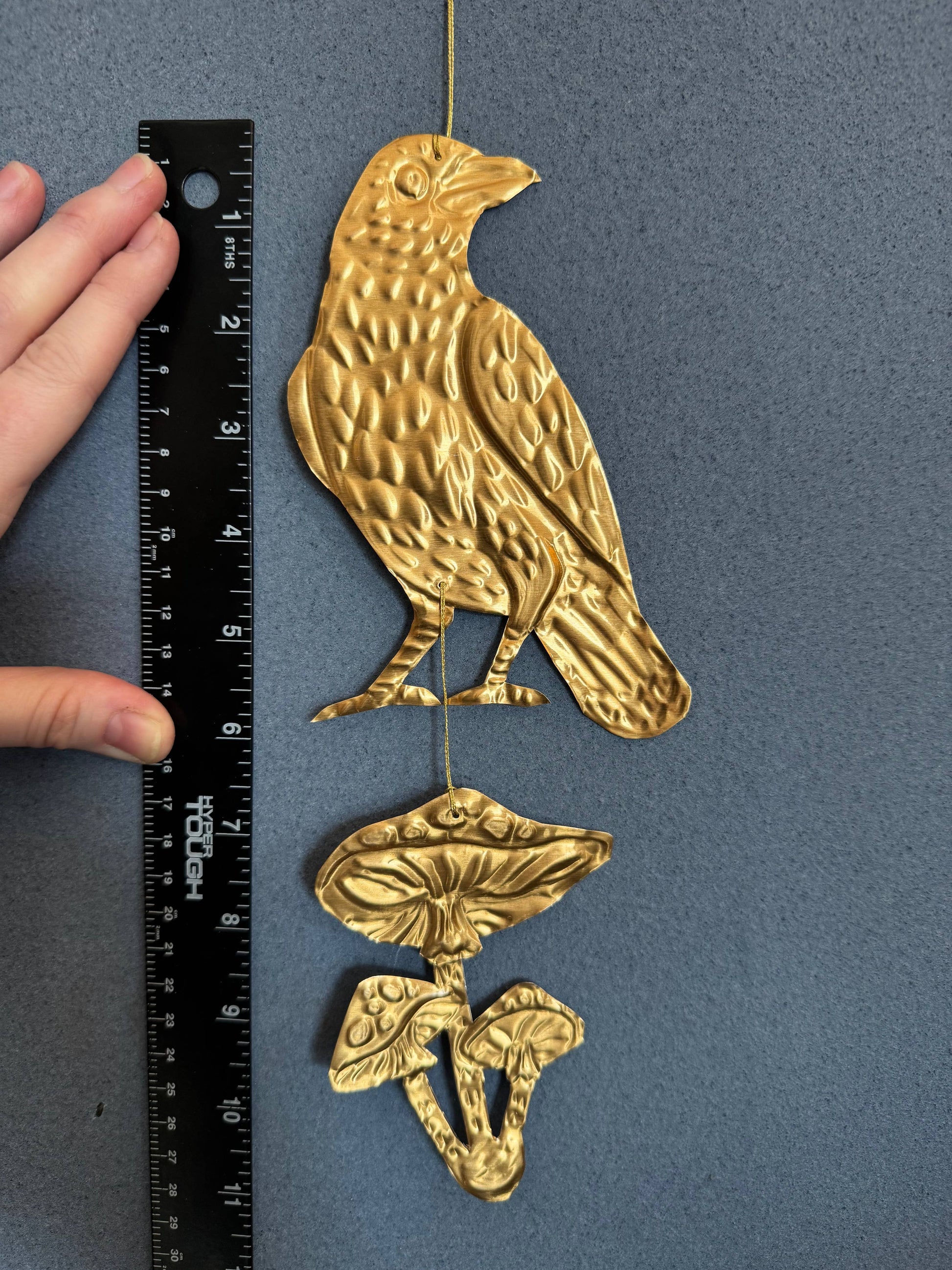 Embossed gold tin Crow and Mushrooms hanging decoration