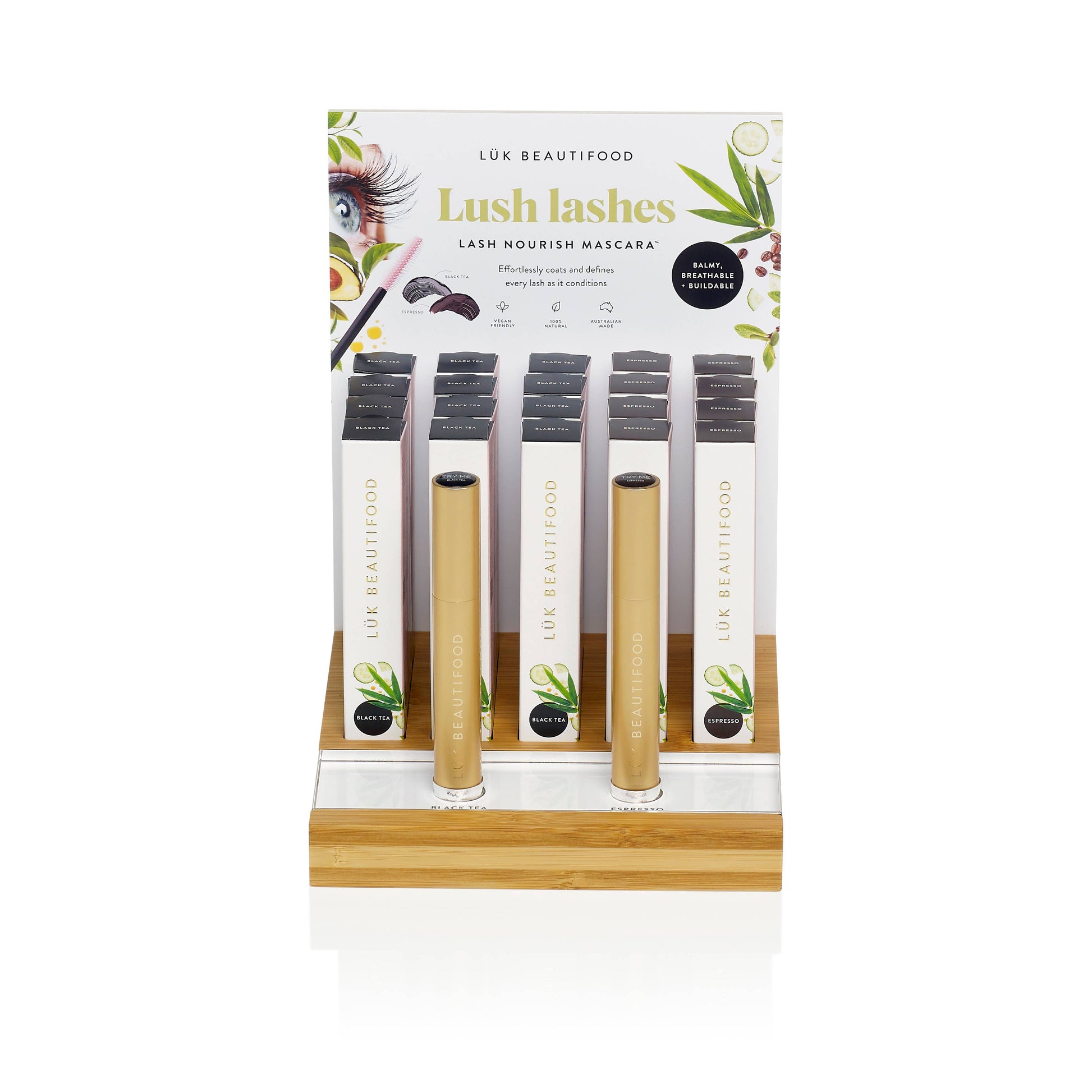 Starter Bundles come pre-packed and contain stock: 2 shades (12 Black Tea & 8 Espresso), testers, free bamboo display unit, consumer hand outs and digital assets.