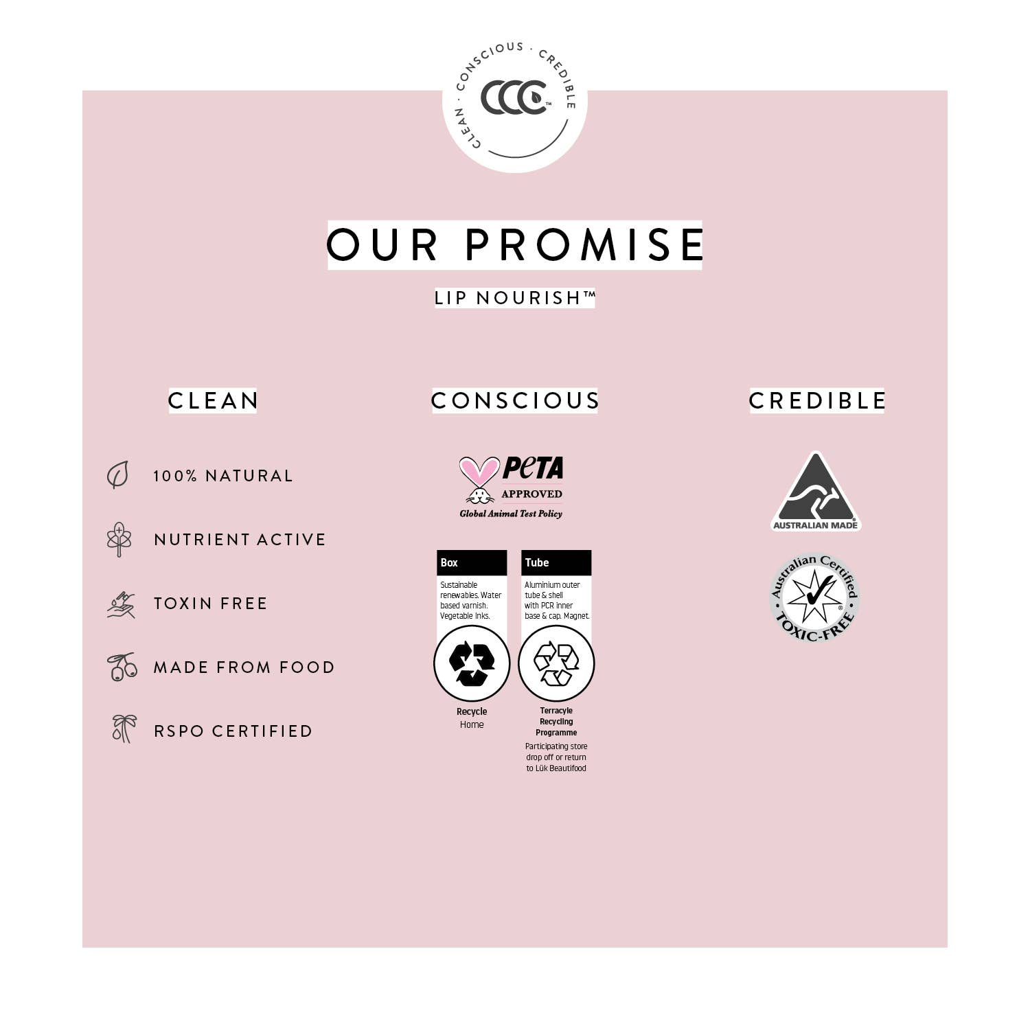 Lip Nourish is a sheer, buildable 100% natural lipstick with the nourishing benefits of a balm, dewy, satin finish & delicious taste. Delivers a buildable wash of creamy colour, inviting shine, hydrated healthy lips & natural look. The synthetic-free, breathable balmy formula instantly & over time quenches and feeds lips with moisture, vitamins and antioxidants while adding a kiss of natural colour that builds with each swipe. Packed with natural goodness, its creamy soft texture melts into lips thanks to the cocoa butter whilst beeswax and plant waxes form a shield to lock moisture in. Nutrient-active botanicals avocado oil, jojoba, vitamin C rich organic cold pressed citrus + Vitamin E deeply hydrate and nourish, helping lips smooth & soften whilst improving & protecting lip health. Natural mineral oxides & edible natural food colourant carmine create beautiful, nude, neutral and mouthwatering colour to suit most skin tones.
