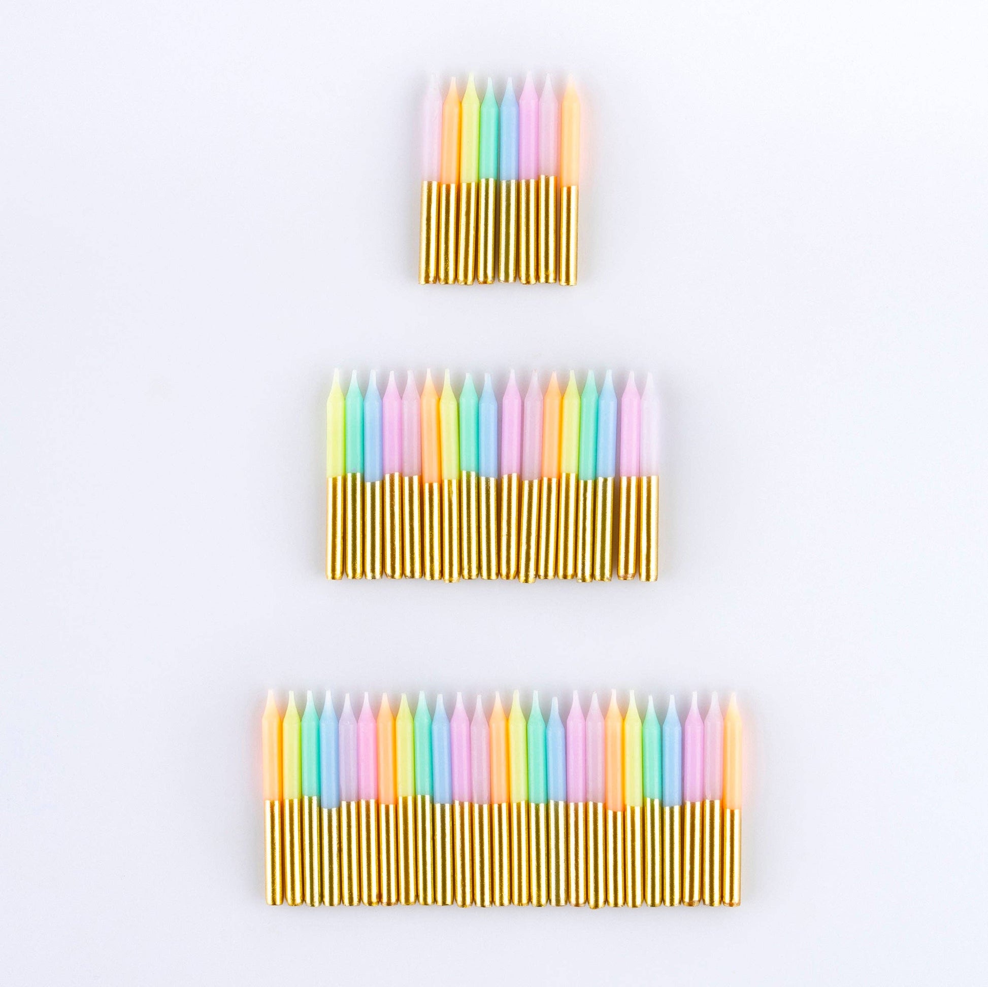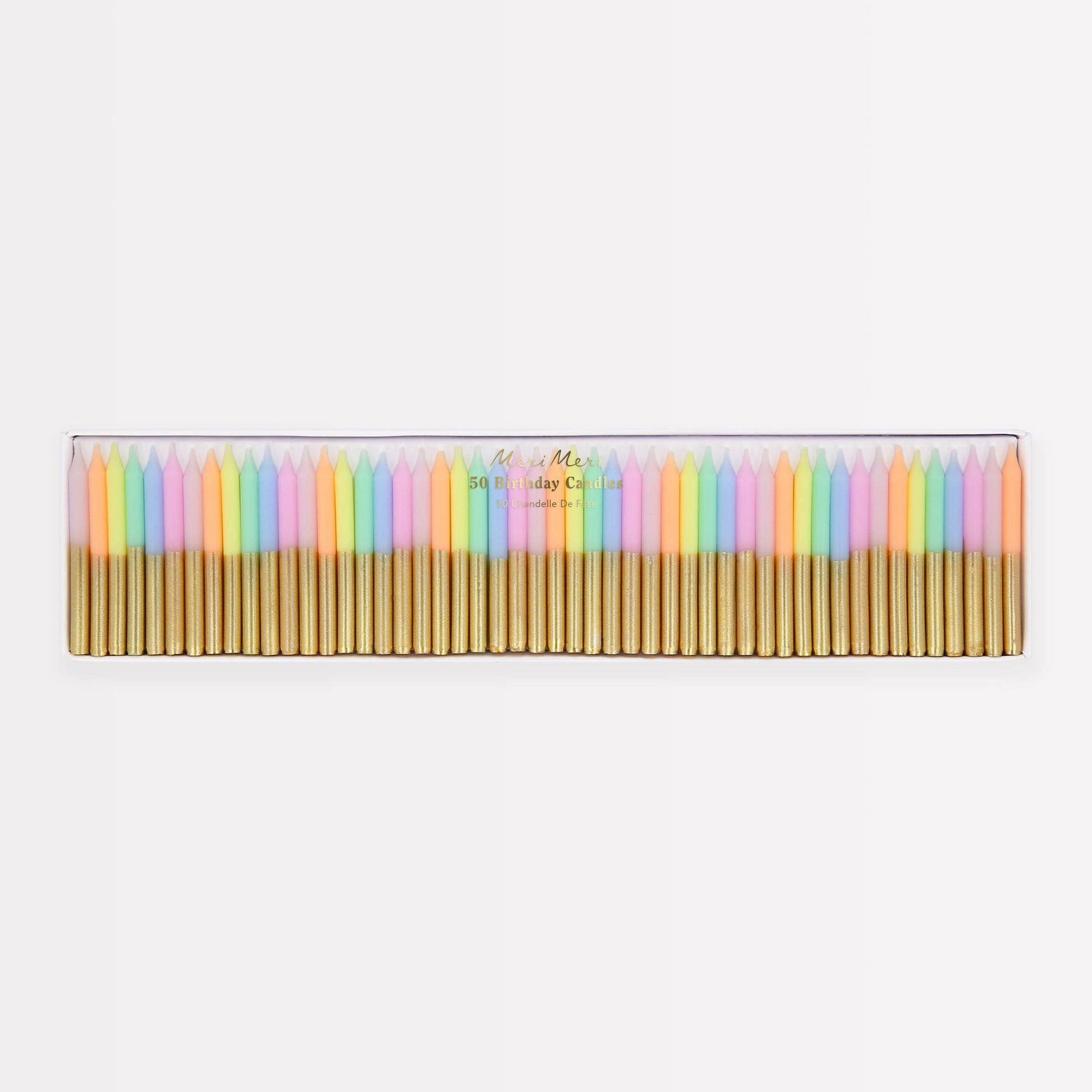 * 50 Birthday candles in six pastel shades of violet, magenta, light pink, peach, yellow, mint.