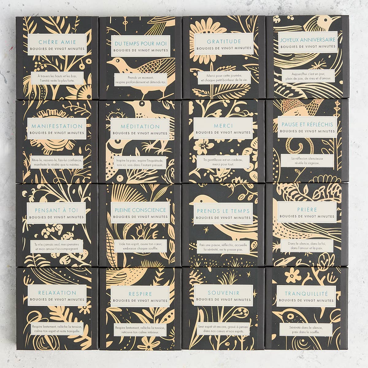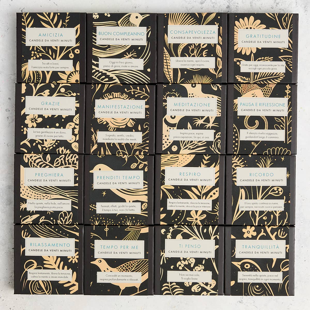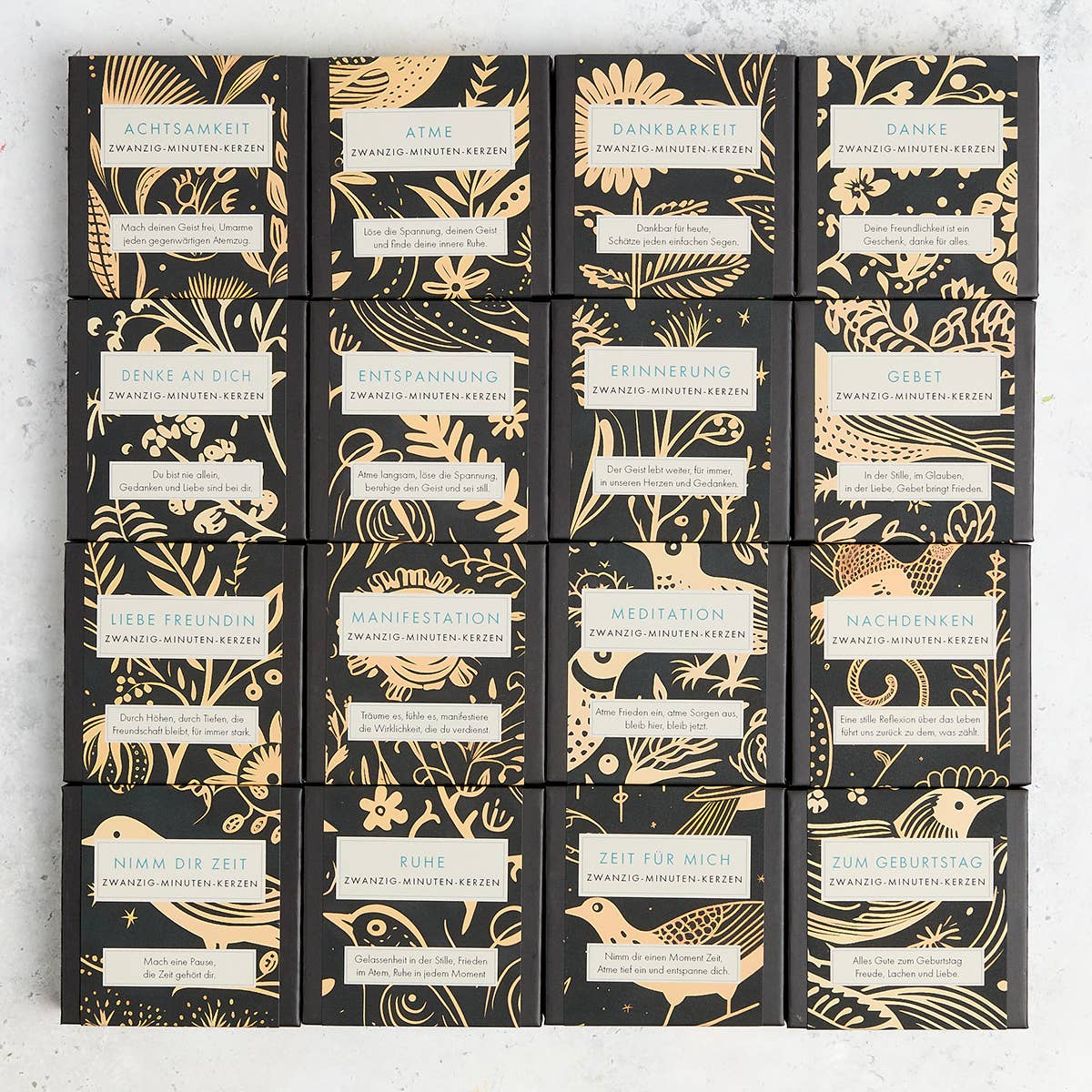 Each box contains 12 x Twenty Minute Candles and a ceramic holder for relaxation, meditation, mindfulness and well-being. 100% pure beeswax.