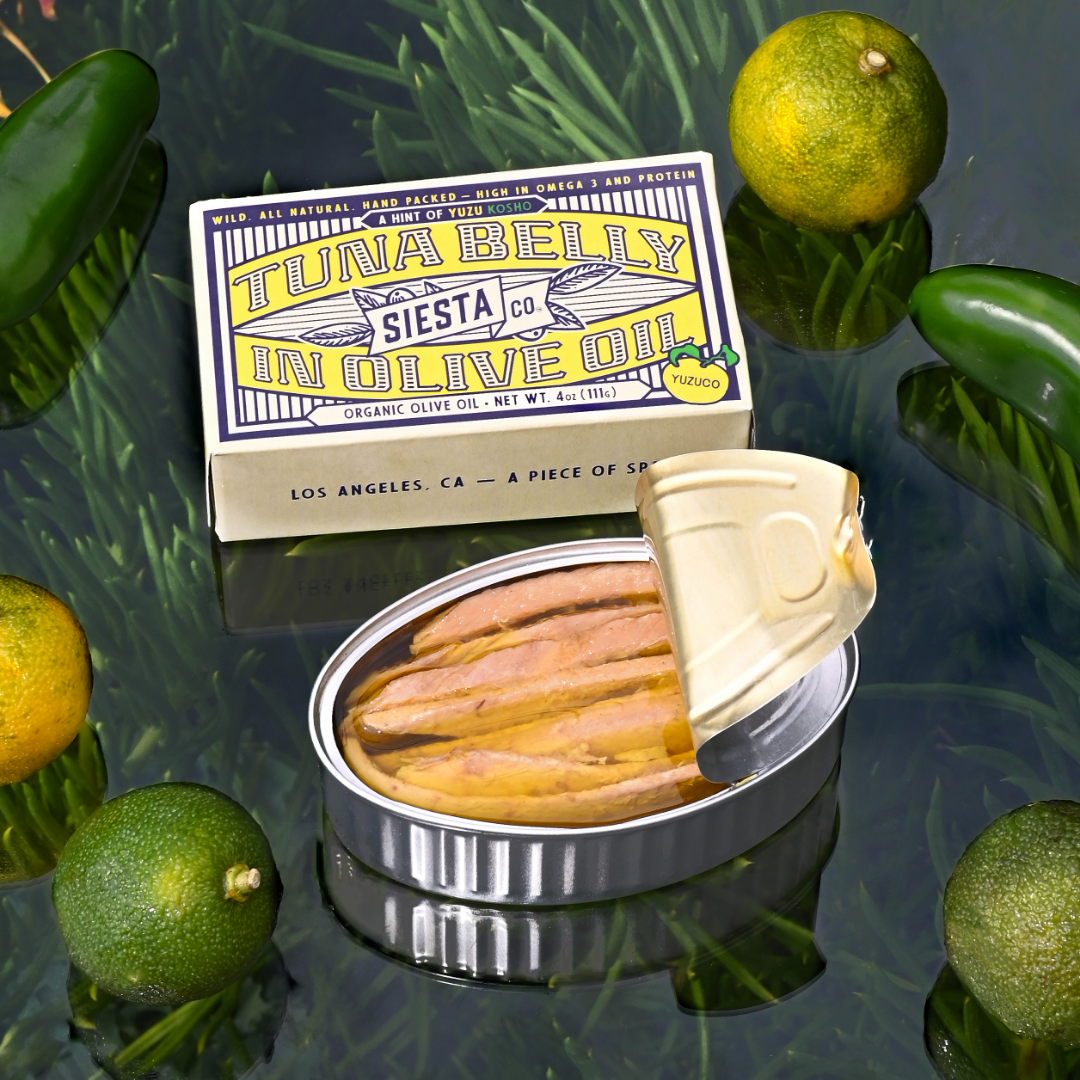 Beloved in Spanish culture and often considered the finest part of the fish, ventresca is a prized cut of tuna belly, known for its rich flavor and delicate texture. Enjoy it elevated with a touch of yuzu koshō, a Japanese seasoning that perfectly complements the tuna belly's rich, buttery flavor. This one-of-a-kind product is both refreshing and delicious, thanks to the addition of yuzu koshō, which adds a bit of acidity and subtle spice to the tuna belly. Enjoy it straight out of the can or on a bed of rice for an easy sushi-like experience. Always keep a can of Siesta's Tuna Belly in Yuzu Koshō on hand for whenever the craving strikes.